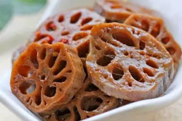 10.一直煮到藕呈平均的紫紅色,關火;把藕片浸泡在鹵湯里,直到變涼后,即可食用