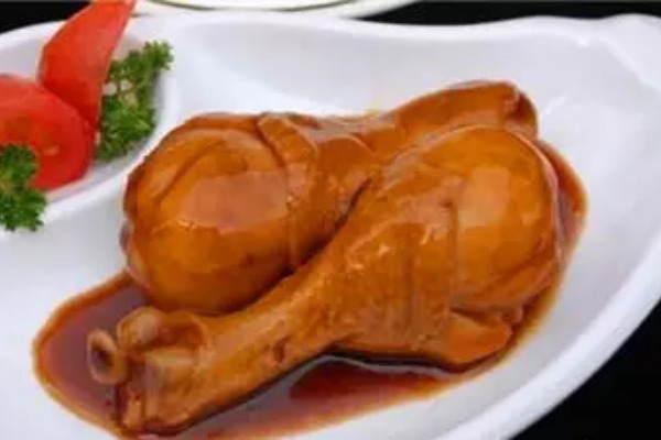 食材:雞腿3個,食鹽,清水,醬油,冰糖,香葉,桂皮,鹵水,八角,料酒,花生油,姜,蒜