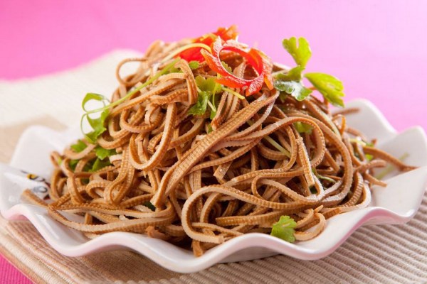 7)撈出鹵好的豆腐絲。8)把豆腐絲切成喜好的長度。