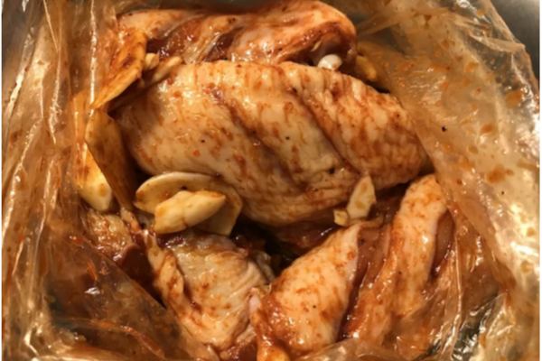 3、將雞翅和腌料放到袋子里進行拍打和揉捏,這樣有助于腌料的充分吸收。