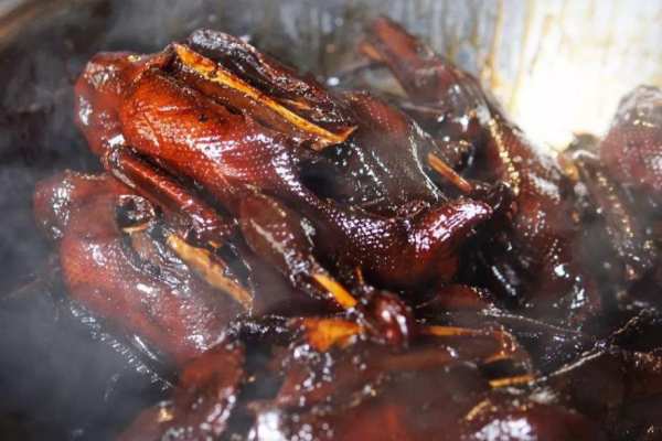 3、鹵制:鹵水調味燒開后,投入老土鴨小火鹵至10分鐘,用重物把老土鴨壓在,以免浸泡不入味。一般情況下,晚上鹵制10分鐘,隔夜后撈出來,如果發現未熟透,可以在煮5分鐘后浸泡熟透即可。