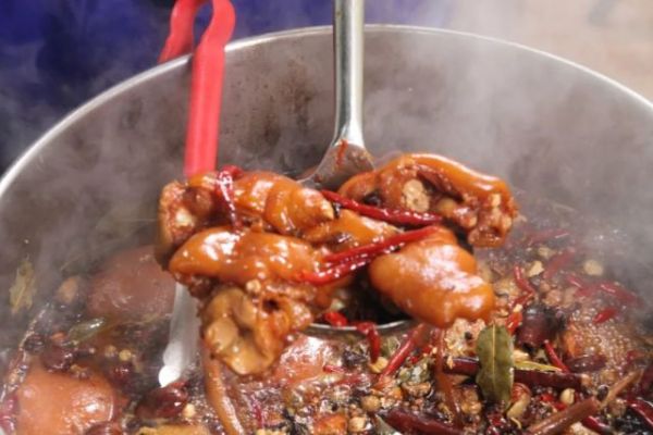 鹵制方法:將肉湯倒入干凈的鹵鍋中,另將八角、桂皮、甘草、陳皮、丁香、草果、小茴香、花椒、枸杞等用紗布包好成香料包,放入鹵鍋中,再加入鮮姜、香茅草、壓破的蜜棗、干蔥頭、拍破的生姜,調入精鹽、蠔油、糖色、料酒、十三香、泡椒節等,上火用大火燒開,打去浮沫,改用中小火熬約1小時,待充分入味后,再調入味精、雞精即成鹵水待用。